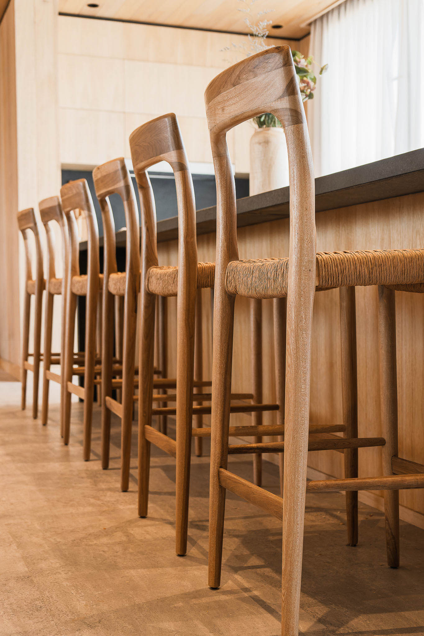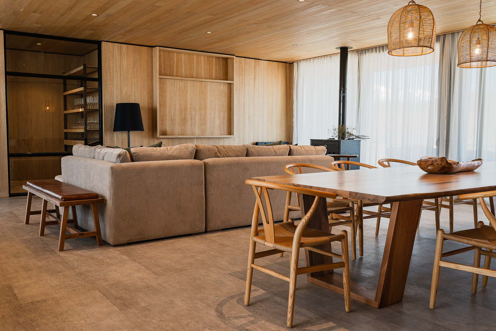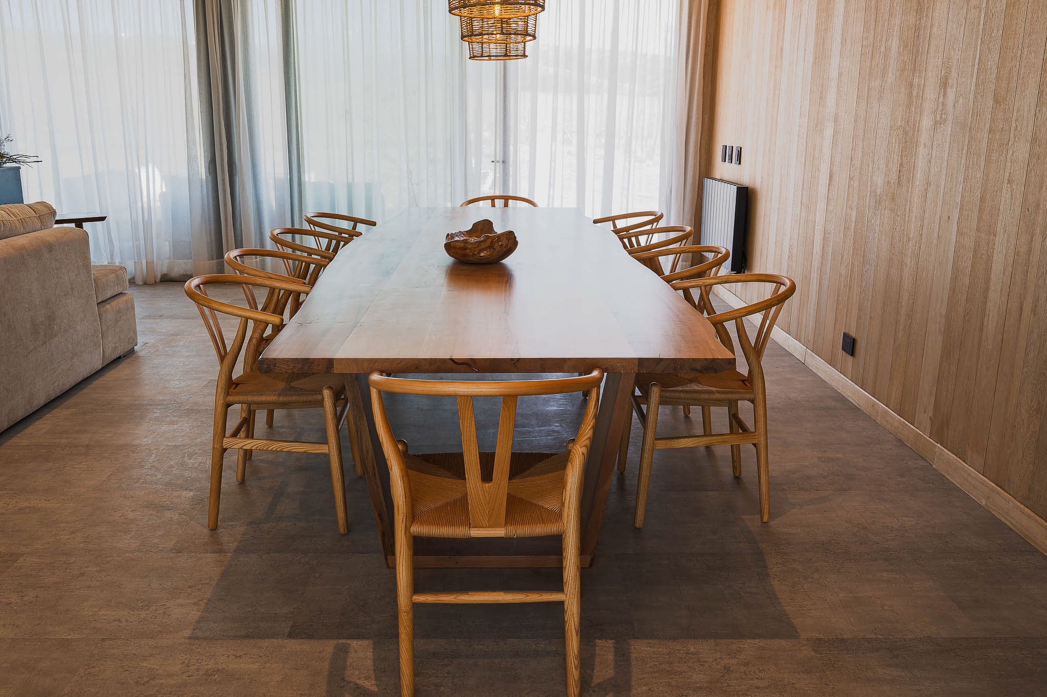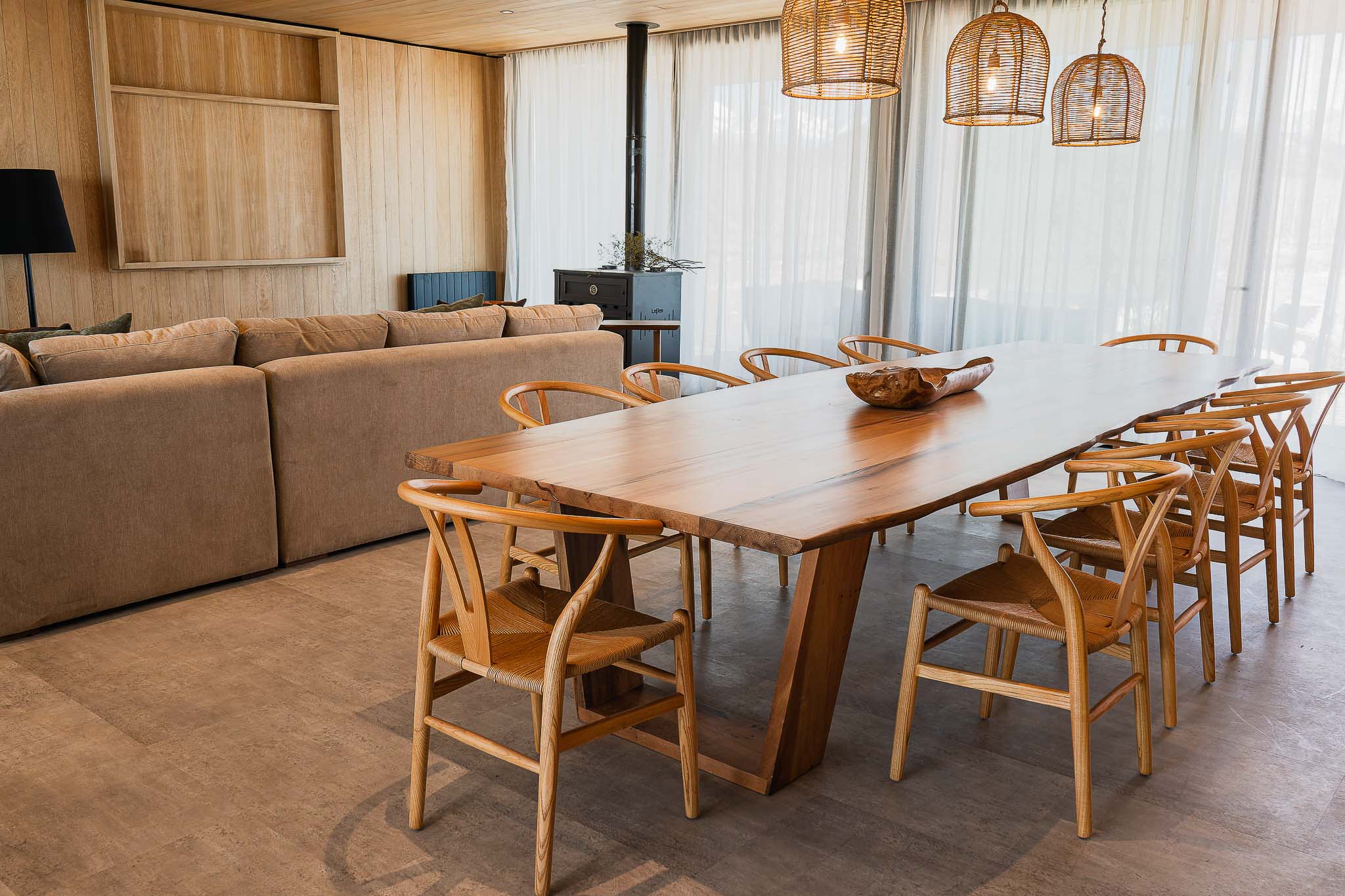 Una gran mesa de madera de zoita, con bordes naturales, se convierte en el centro de la experiencia. La acompañan las sillas Wishbone, de inspiración escandinava, tejidas a mano y livianas, aportando ligereza visual y equilibrio.