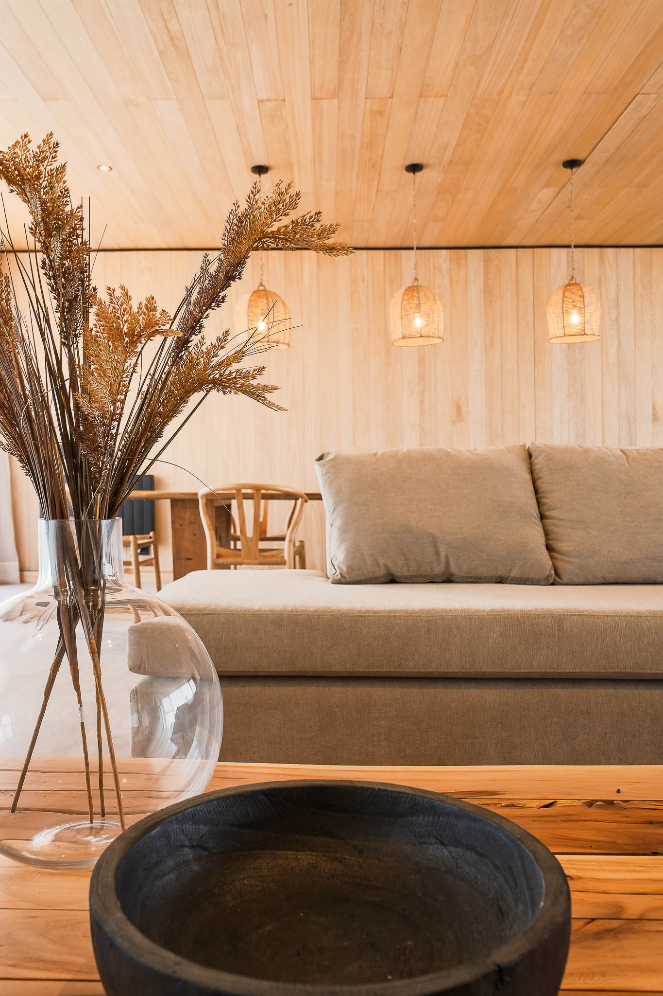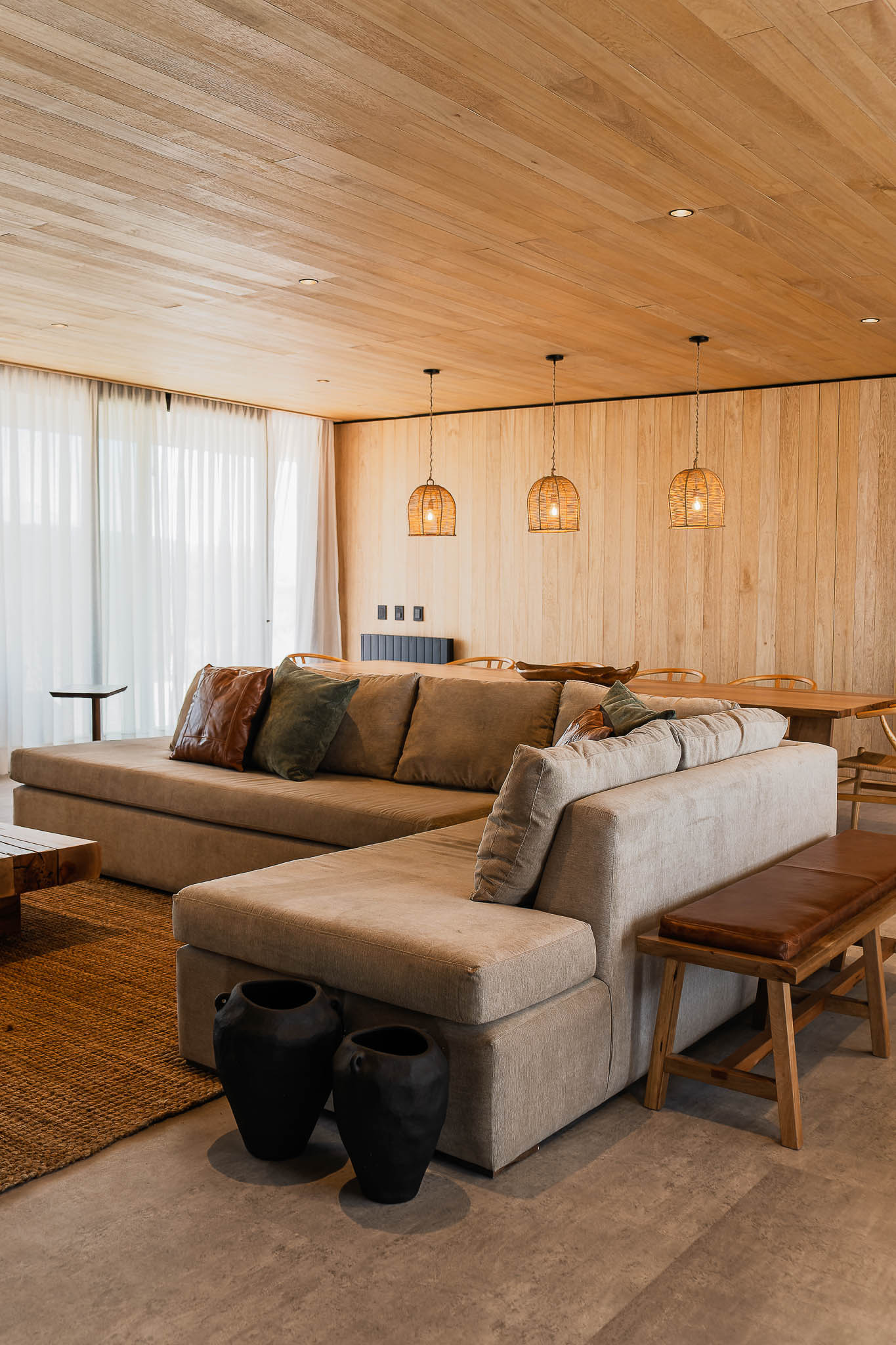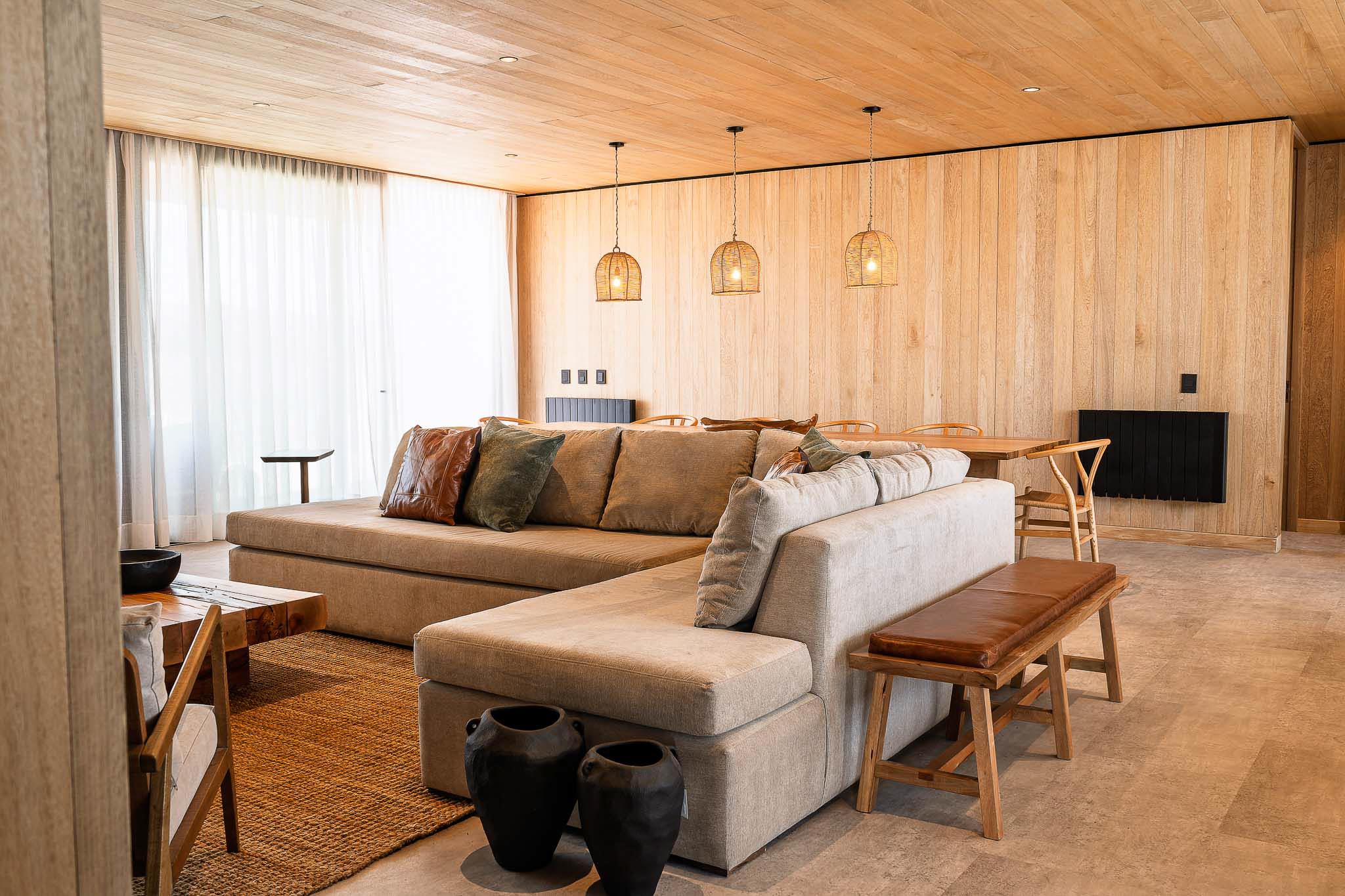 Una gran mesa de madera de zoita, con bordes naturales, se convierte en el centro de la experiencia. La acompañan las sillas Wishbone, de inspiración escandinava, tejidas a mano y livianas, aportando ligereza visual y equilibrio.