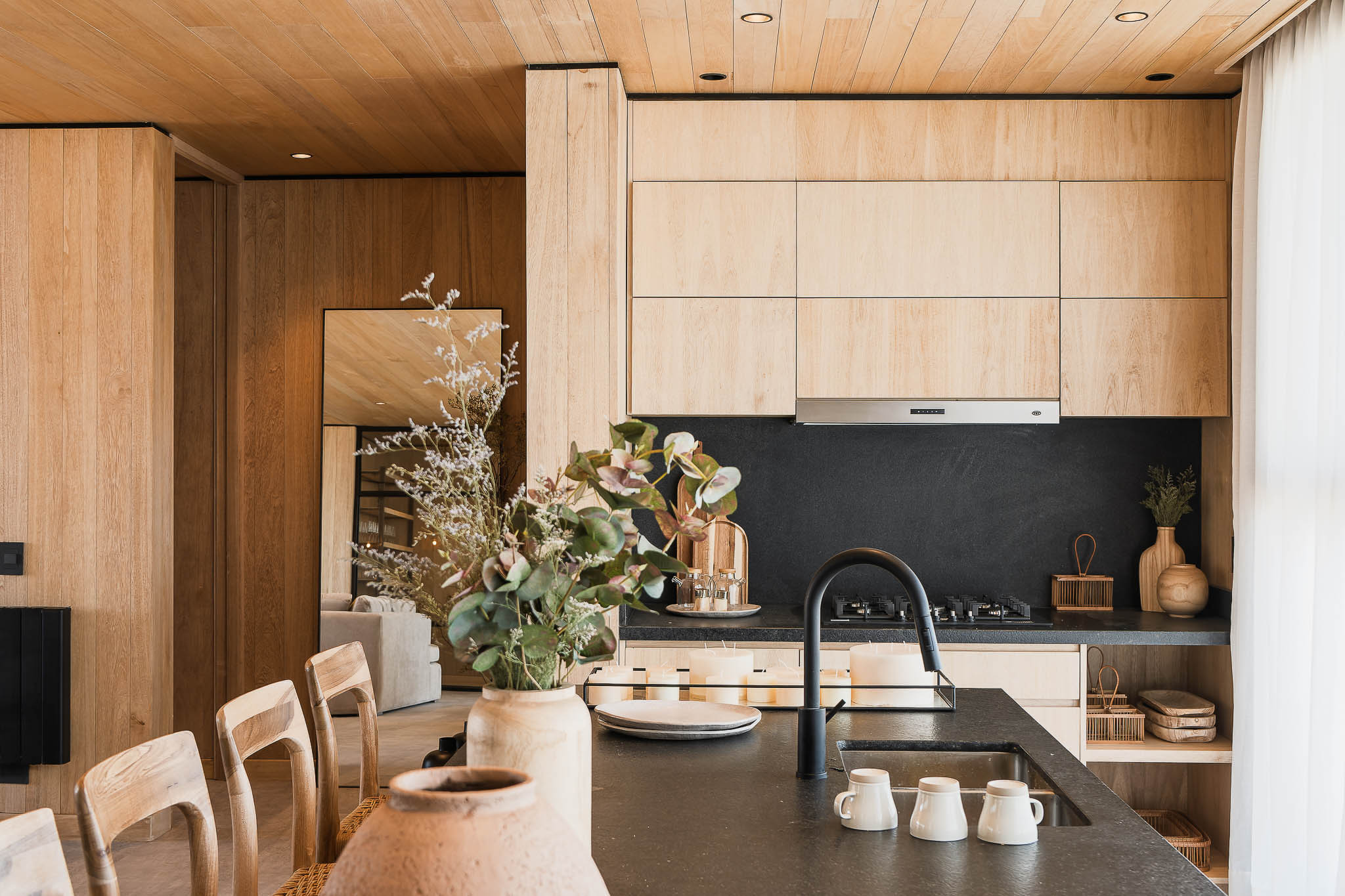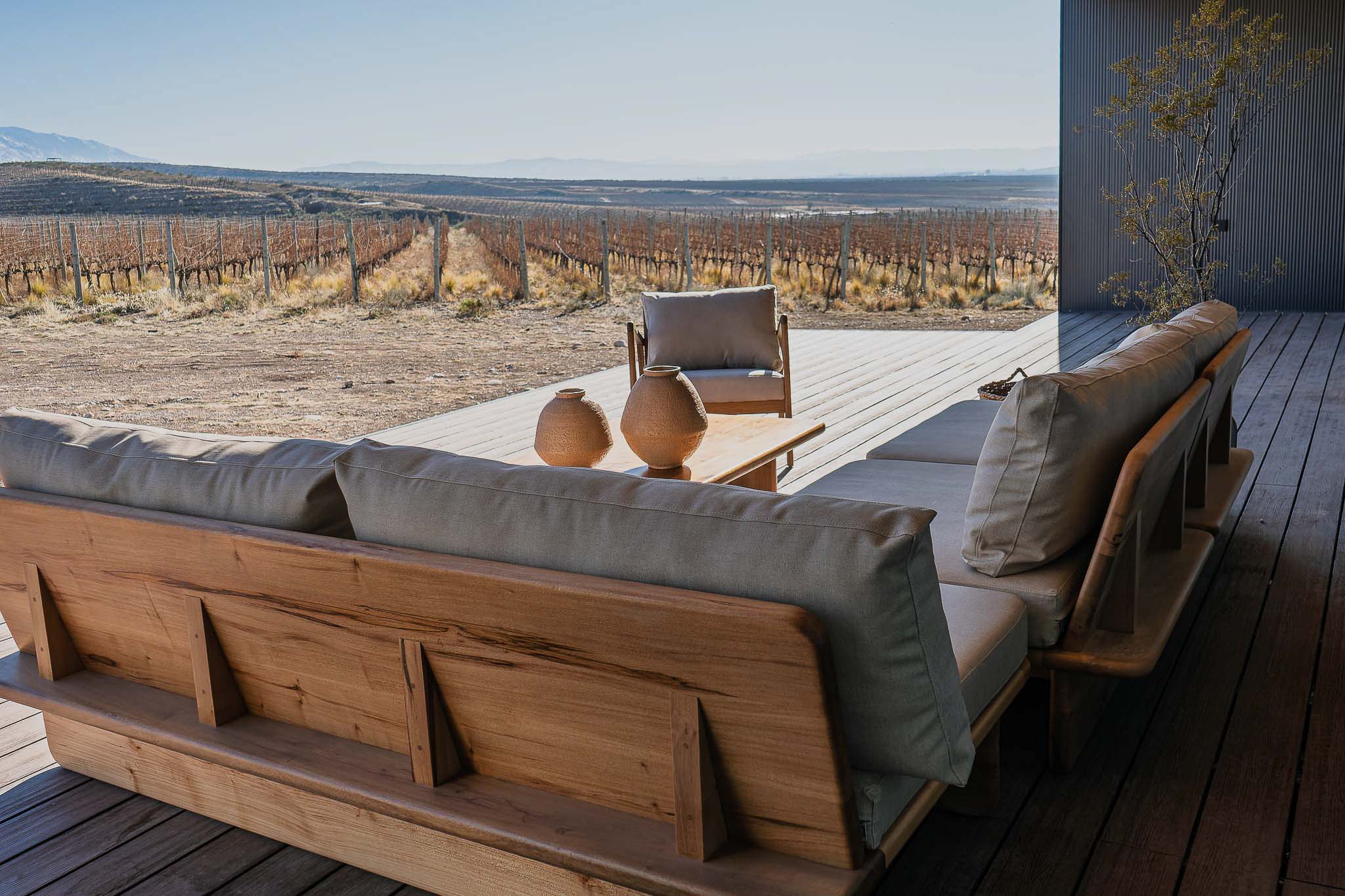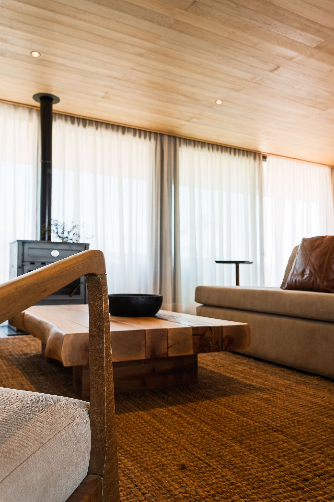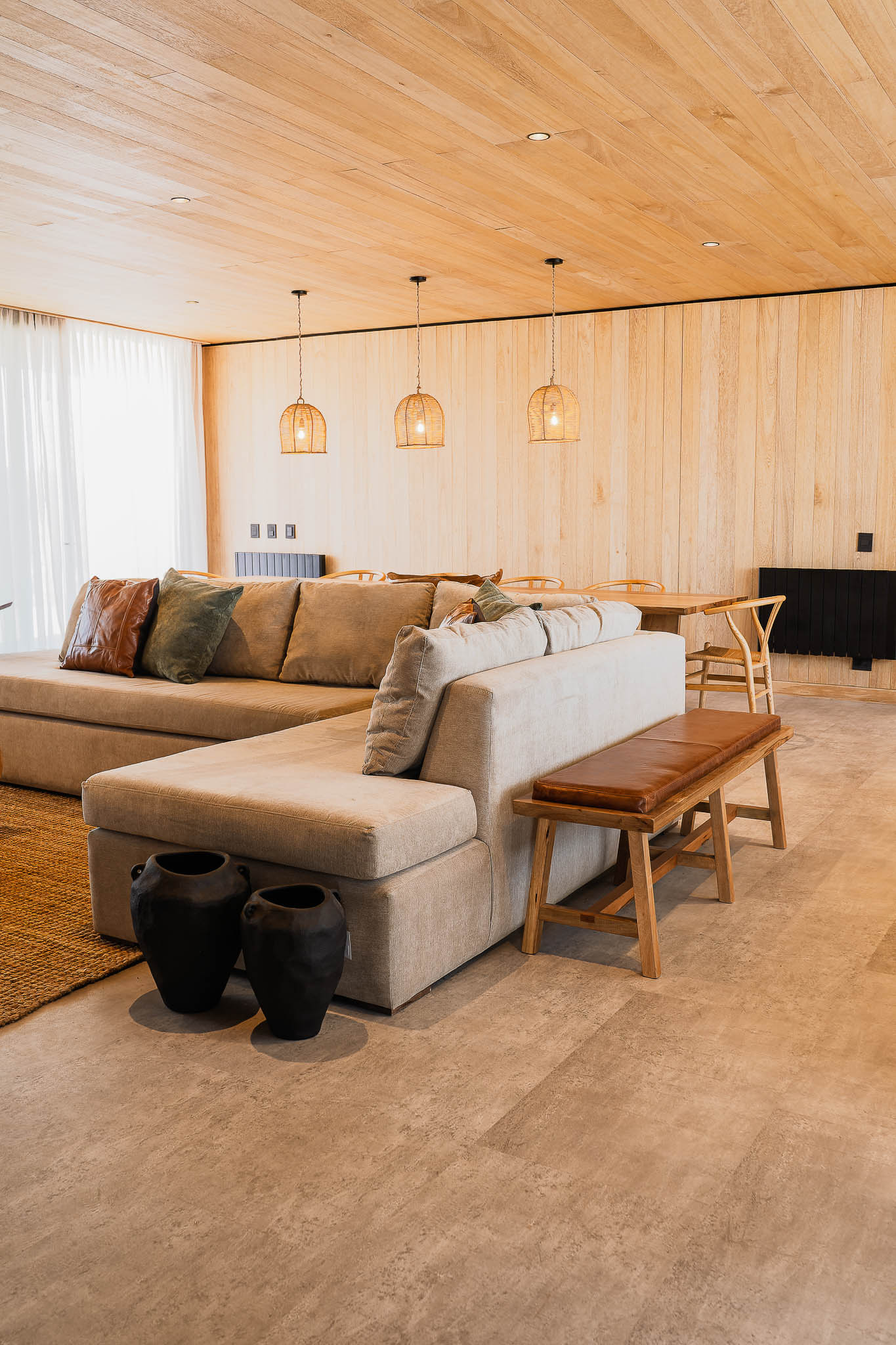 Una gran mesa de madera de zoita, con bordes naturales, se convierte en el centro de la experiencia. La acompañan las sillas Wishbone, de inspiración escandinava, tejidas a mano y livianas, aportando ligereza visual y equilibrio.